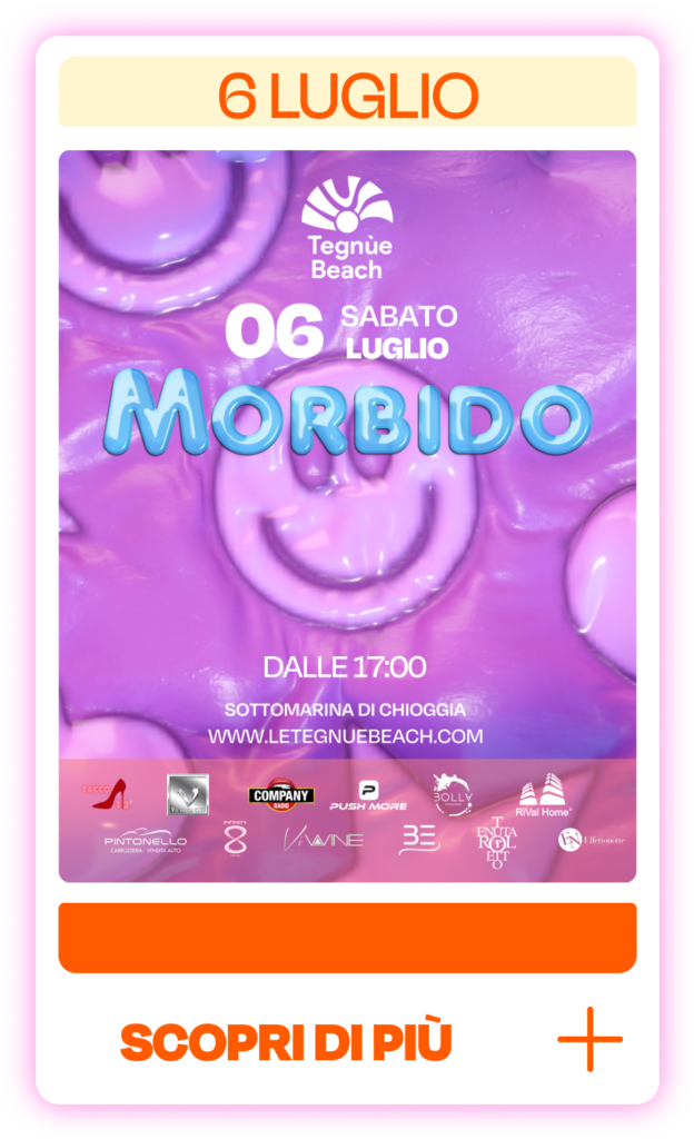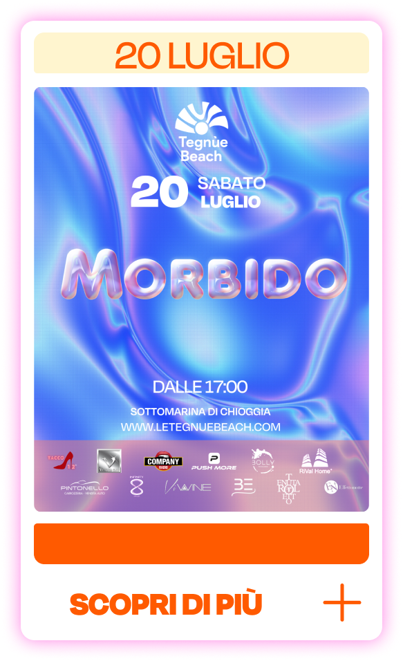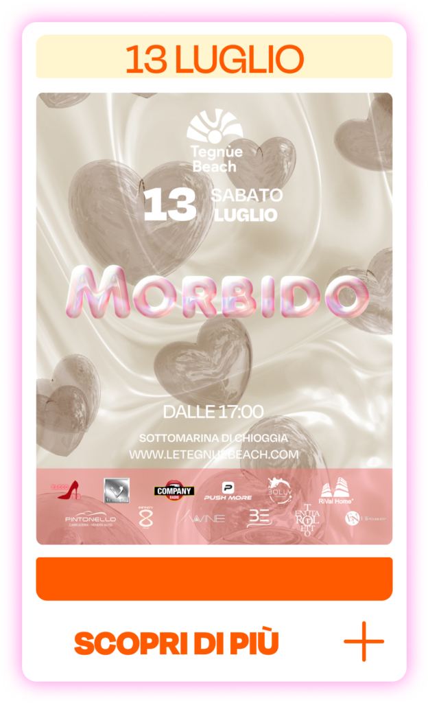 MORBIDO 13 LUGLIO Info e prenotazioni:+39 334 146 9674+39 349 673 7824+39 340 936 4665 Prenota qui Via Barbarigo 147 – Sottomarina di Chioggia (VE)